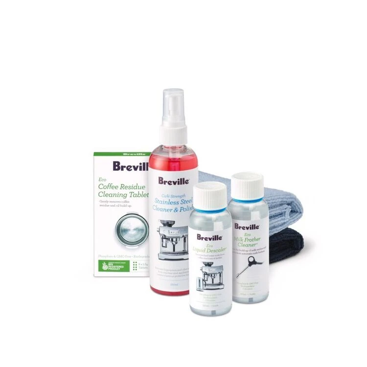 | Contents | 1 x Eco Descaler 120ml1 x Eco Milk Frother Cleaner 120ml1 x Eco Coffee Residue Cleaning Tablets 8’s2 x Microfibre Cleaning Cloths1 x Stainless Steel Cleaner and Polish 250ml |