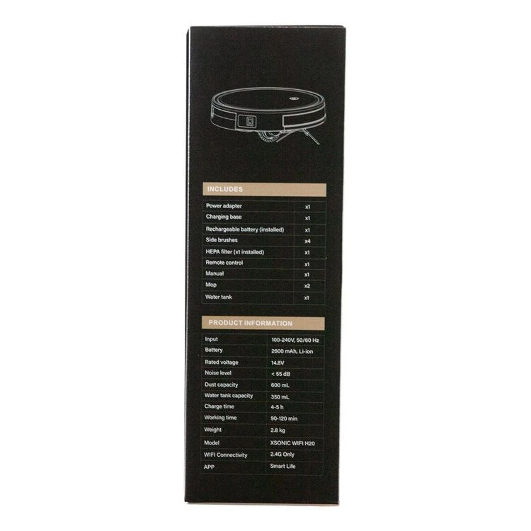 | Contents | 1 x Mygenie Xsonic Robotic Vacuum1 x Power Adaptor1 x Charging Base1 x Removable Battery (Installed)4 x Side Brushes2 x HEPA Filters (1 x installed and 1 x spare)1 x User Manual2 x Mop Cloths1 x Water Tank |