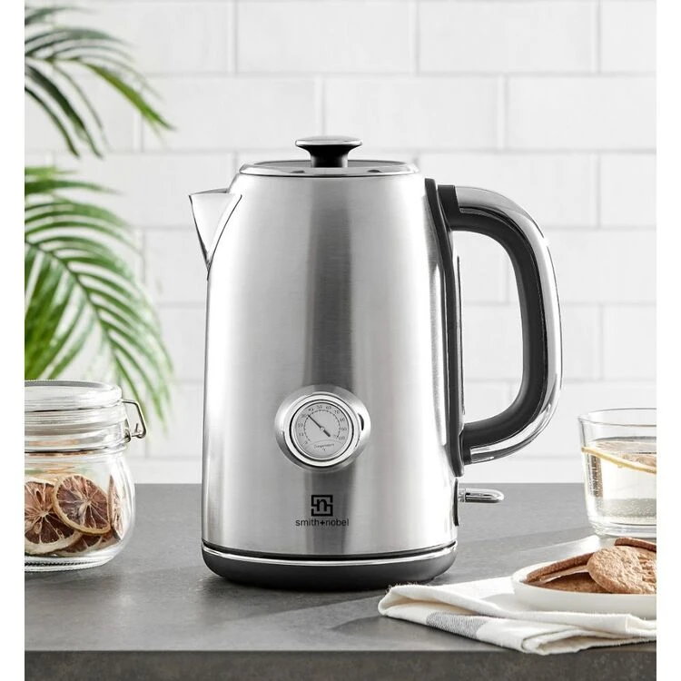 The Smith & Nobel 1.7 Litre Stainless Steel Retro Kettle TM1108T is the kitchen staple that wont let you down with its stylish Stainless Steel retro finishing that will suit any kitchen. Boasting a plentiful 1.7L capacity, this stainless steel kettle has 360 degree base rotation, cordless kettle body, a sturdy grip handle, and one touch open lid button. It features also a clear temperature viewing window, a bright illuminating blue LED on its power switch, and automatic shuts off after boiling. Shop the Smith & Nobel range today at Harris Scarfe!