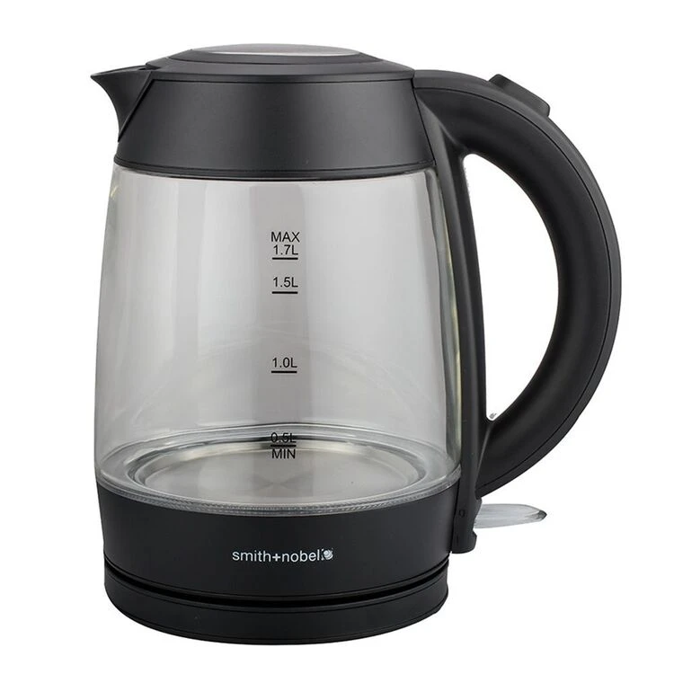 This reliable Smith & Nobel Glass Kettle Black boasts a durable glass body and quick boil technology, a kitchen staple perfect your any home! It features an easy to use cordless design with a 360° rotating base for right and left hand users, as well as a sleek black trim and LED on/off switch. Brew your morning tea or coffee with this Smith & Nobel Glass Kettle!
