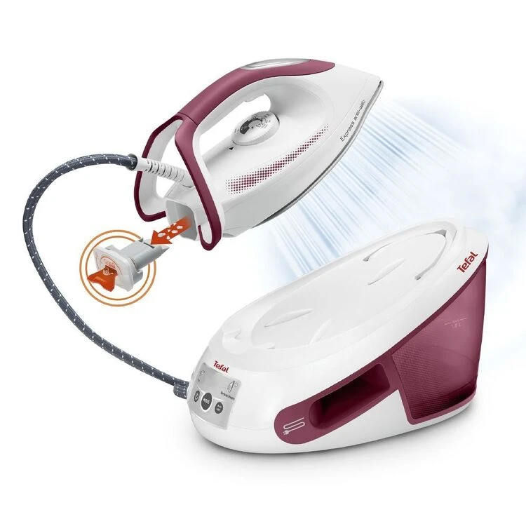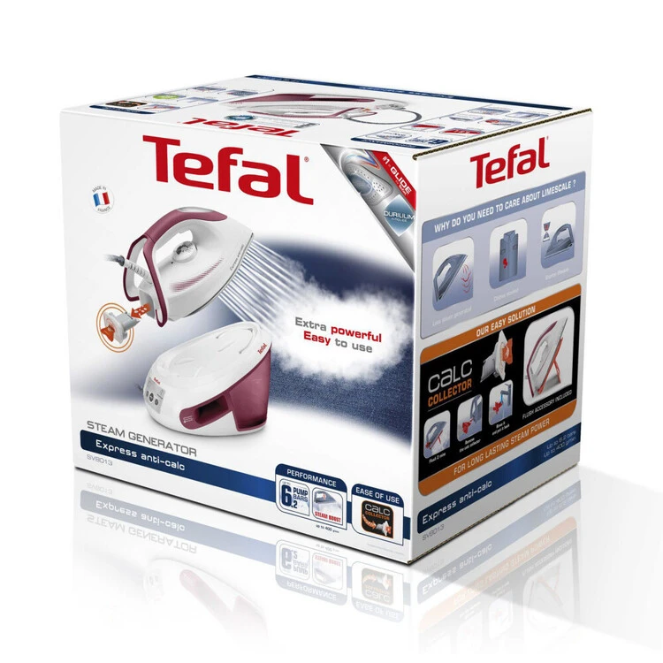 The Tefal Express Anti-Calc Steam Generator SV8013 brings together an advanced maintenance system with outstanding steam power that’s ideal for any fabric, delivering fast and easy results with performance that was built to last. A new removable calc collector makes maintenance effortless and ensures longer product life with peak efficiency. A continuous steam output of 110 g/minute comes together with 6.2-bar pump pressure for faster ironing sessions, while the raw power of a 400 g/minute steam boost smooths out even the most stubborn creases. Featuring the outstanding glide and durability of a Durilium AirGlide Autoclean soleplate and advanced features for maximum convenience, discover the steam station with pure ironing power and long-lasting steam performance. It also comes in with a handy door hook accessory for your last-minute vertical steaming.