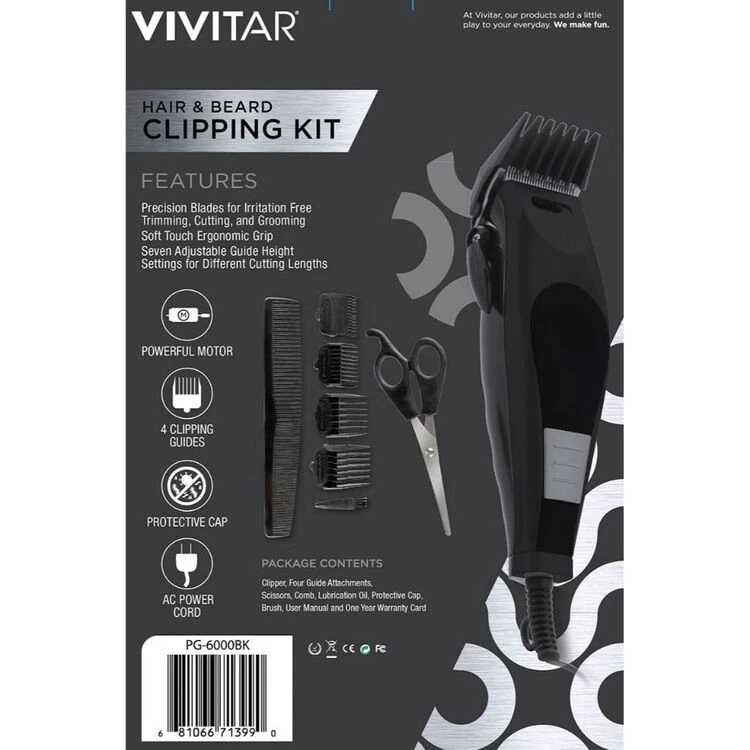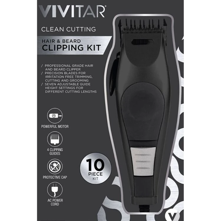 Give yourself the self-care you deserve with the Vivitar 10 Piece Hair And Beard Clipping Kit, featuring a professional grade hair and beard clipper to keep you looking fresh and feeling your best. Complete with 4 clipping guides, brushes, comb and scissors, this grooming set has everything you need to get styling!